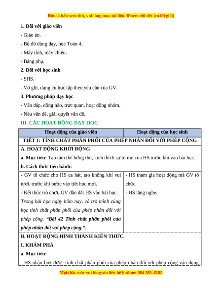 Giáo án Tính chất phân phối của phép nhân đối với phép cộng Toán 4 Kết nối tri thức