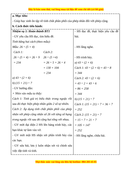 - Giúp học sinh ôn tập về tính chất phân phối của phép nhân đối với phép cộng.