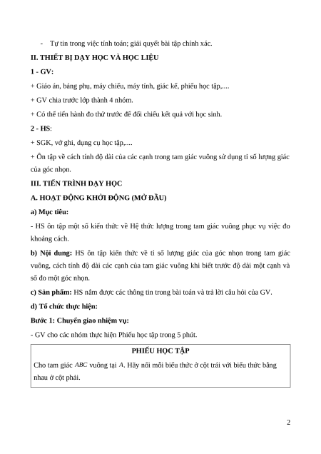 + Ôn tập về cách tính độ dài của các cạnh trong tam giác vuông sử dụng tỉ số lượng giác của góc nhọn.