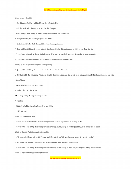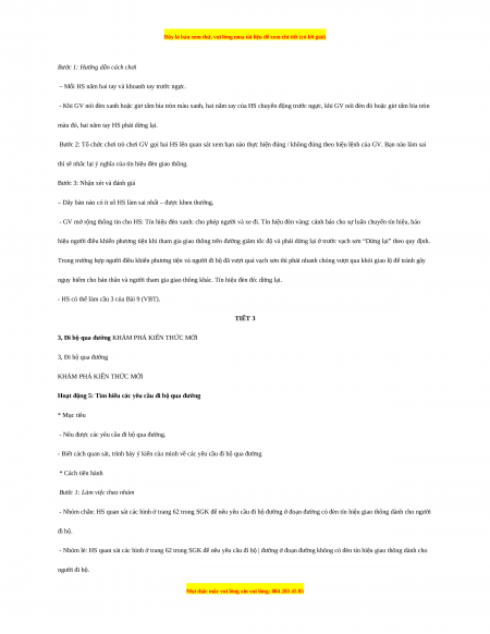 * Về vận dụng kiến thức, kĩ năng đã học Thực hành đi bộ qua đường theo sơ đồ: đoạn đường không có đèn tín hiệu giao thông ; đoạn đường có đèn tín hiệu giao thông. II. Chuẩn bị: