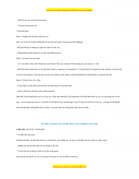 - Quan sát, đặt được câu hỏi và trả lời câu hỏi về những cây và con vật nơi tham quan.