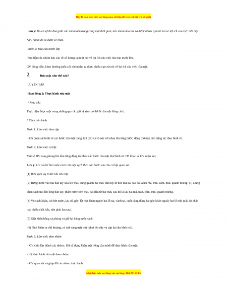 Lưu ý: GV có thể làm mẫu rửa tay đúng cách cho cả lớp quan sát trước khi các em thực hành rửa tay thật theo nhóm,