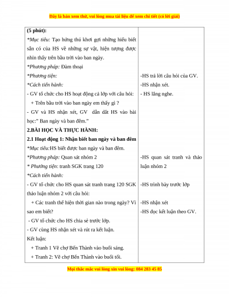 2.1 Hoạt động 1: Nhận biết ban ngày và ban đêm