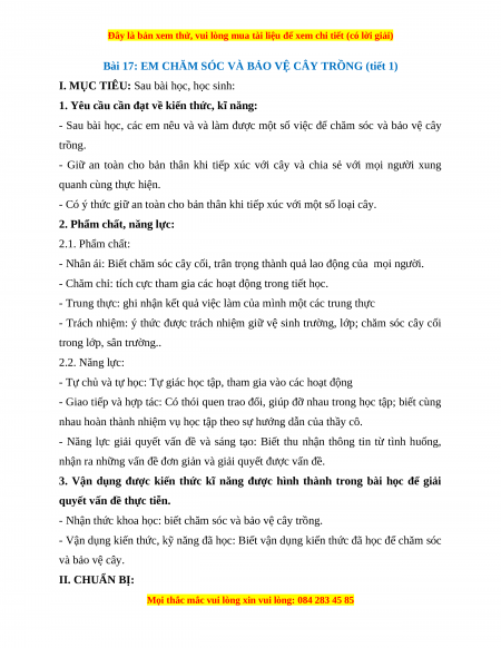 - Vận dụng kiến thức, kỹ năng đã học: Biết vận dụng kiến thức đã học để chăm sóc và bảo vệ cây. II. CHUẨN BỊ: