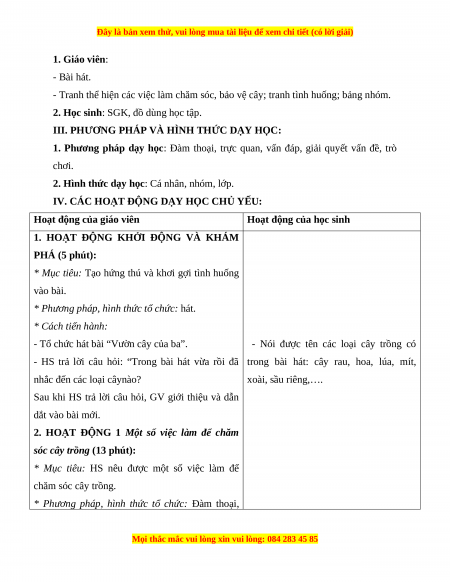 Giáo án TNXH 1 Chân trời sáng tạo Em chăm sóc và bảo vệ cây trồng