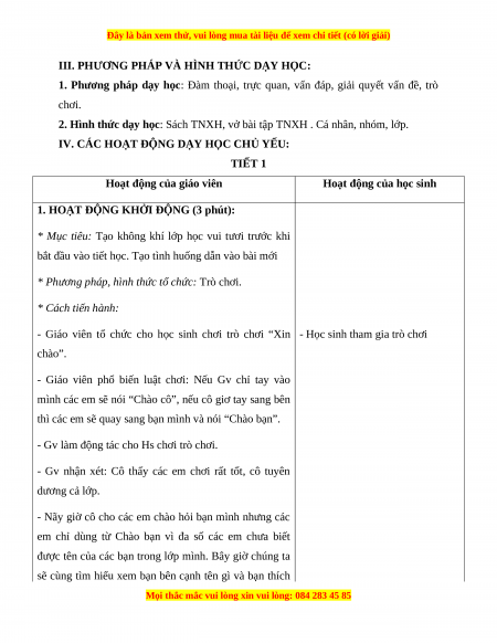 1. Phương pháp dạy học: Đàm thoại, trực quan, vấn đáp, giải quyết vấn đề, trò chơi.