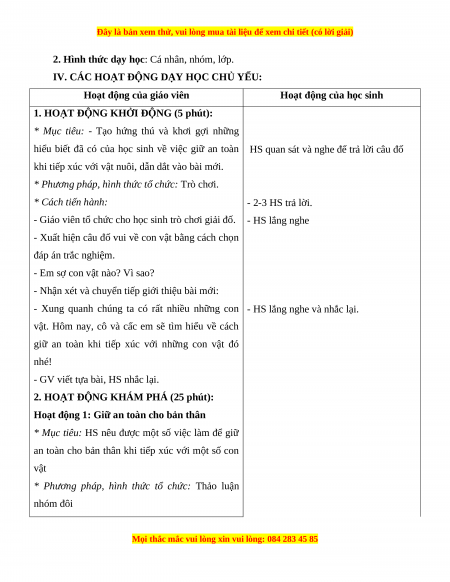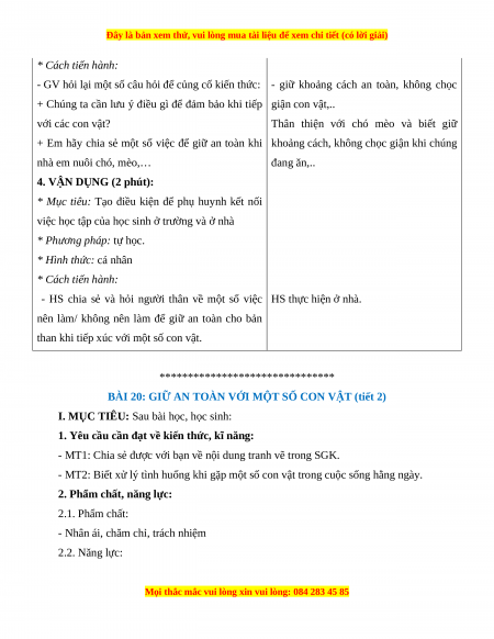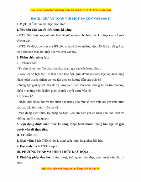 - MT1: Nêu được một số việc làm để giữ an toàn cho bản thân khi tiếp xúc với một số con vật