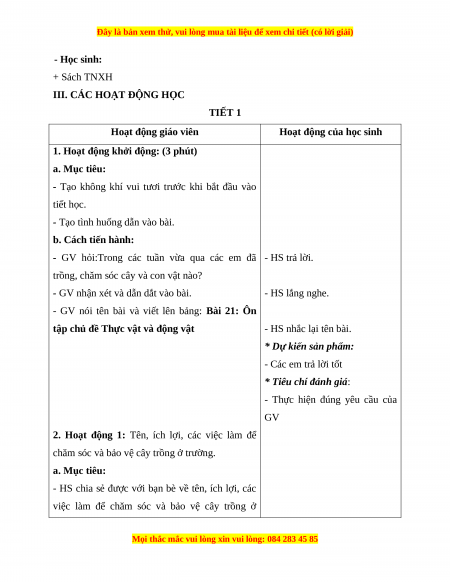 III. CÁC HOẠT ĐỘNG HỌC TIẾT 1