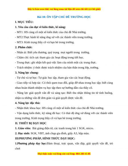 Bài 10: ÔN TẬP CHỦ ĐỀ TRƯỜNG HỌC I. MỤC TIÊU: