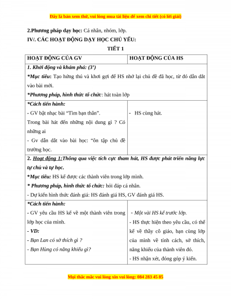 * Phương pháp, hình thức tổ chức: hỏi đáp cá nhân, nhóm đôi.