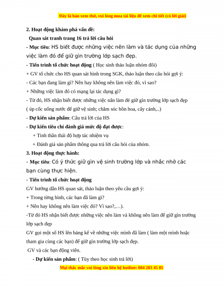 - Mục tiêu: Có ý thức giữ gìn vệ sinh trường lớp và nhắc nhở các bạn cùng thực hiện.