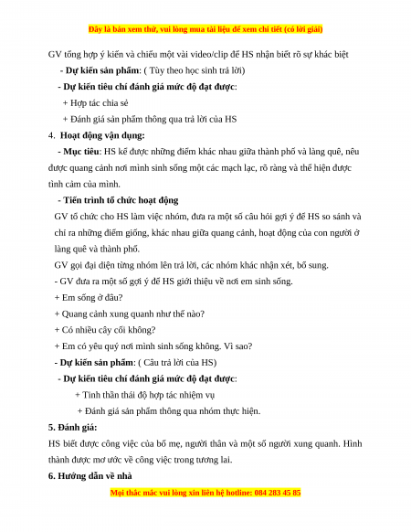 - Mục tiêu: HS kể được những điểm khác nhau giữa thành phố và làng quê, nêu