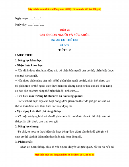 Chủ đề: CON NGƯỜI VÀ SỨC KHỎE Bài 20: CƠ THỂ EM (3 tiết) TIẾT 1, 2 I.MỤC TIÊU:
