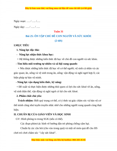 Bài 25: ÔN TẬP CHỦ ĐỀ CON NGƯỜI VÀ SỨC KHỎE (2 tiết) I.MỤC TIÊU