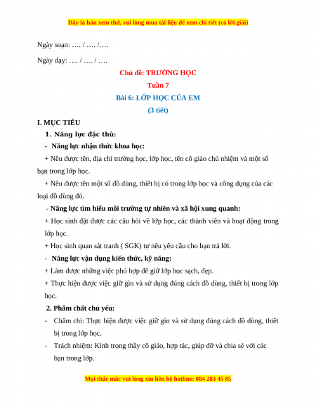 Bài 6: LỚP HỌC CỦA EM (3 tiết) I. MỤC TIÊU