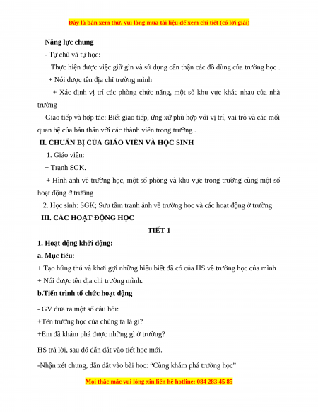 III. CÁC HOẠT ĐỘNG HỌC TIẾT 1