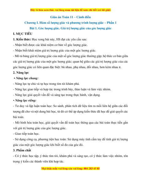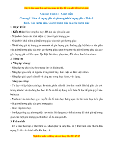 Bài 1. Góc lượng giác. Giá trị lượng giác của góc lượng giác I. MỤC TIÊU
