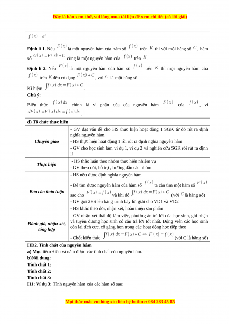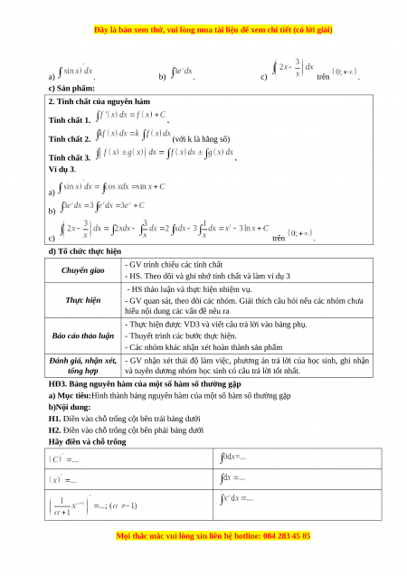 a) Mục tiêu:Hiểu và nắm được các tính chất của nguyên hàm. b)Nội dung: Tính chất 1: Tính chất 2: Tính chất 3: