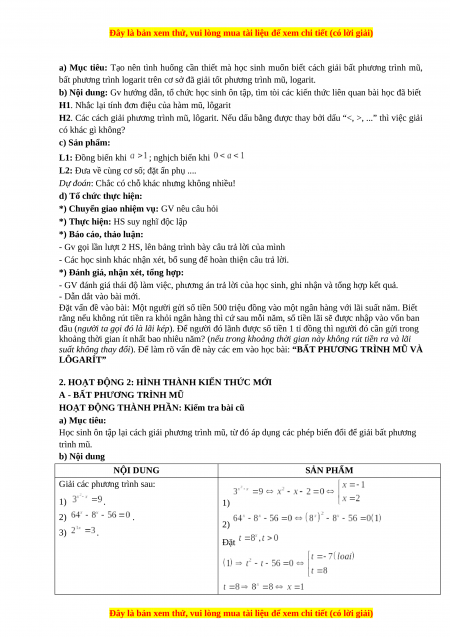 H2. Các cách giải phương trình mũ, lôgarit. Nếu dấu bằng được thay bởi dấu “<, >, ...” thì việc giải có khác gì không? c) Sản phẩm: L1: Đồng biến khi ; nghịch biến khi