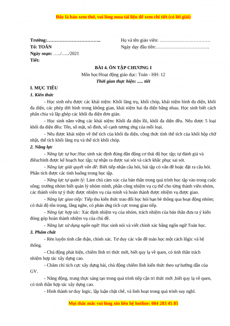 Môn học/Hoạt động giáo dục: Toán - HH: 12