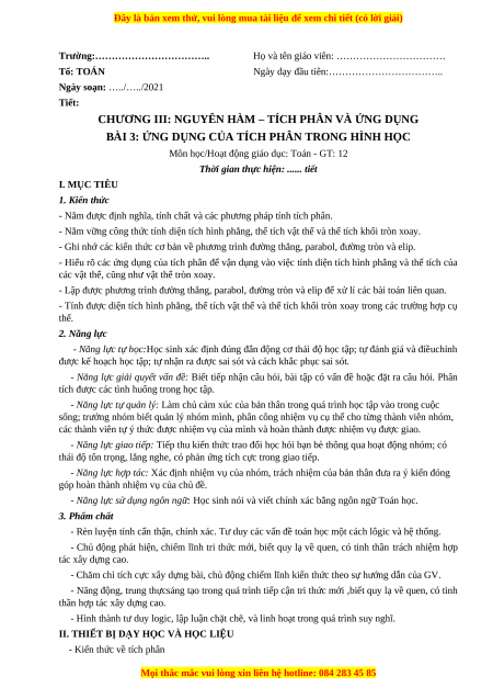 - Tính được diện tích hình phẳng, thể tích vật thể và thể tích khối tròn xoay trong các trường hợp cụ thể. 2. Năng lực
