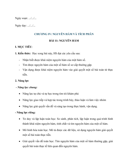 CHƯƠNG IV: NGUYÊN HÀM VÀ TÍCH PHÂN BÀI 11: NGUYÊN HÀM I. MỤC TIÊU: