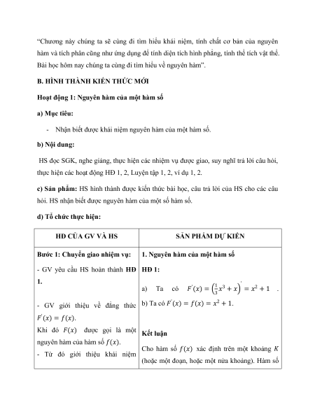 Hoạt động 1: Nguyên hàm của một hàm số a) Mục tiêu: