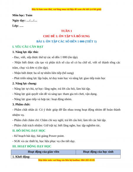 BÀI 1: ÔN TẬP CÁC SỐ ĐẾN 1 000 (TIẾT 1)