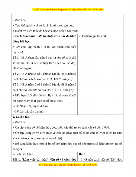 + Ôn tập, củng cố về kiến thức đọc, viết, xếp thứ tự, so sánh các số đến 1 000.