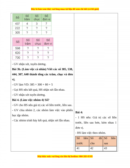 + Bổ sung kiến thức mới về ba số liên tiếp (dựa vào số liên trước, số liền sau trên tia số đã học). - Cách tiến hành: Bài 1:
