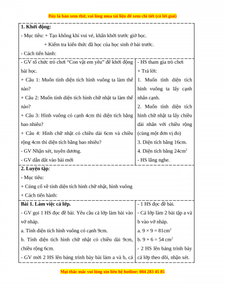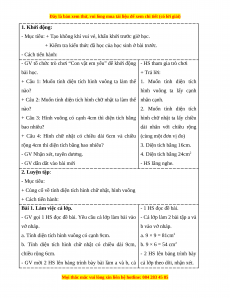 + Củng cố về tính diện tích hình chữ nhật, hình vuông + Cách tiến hành:
