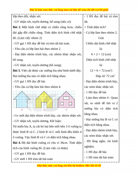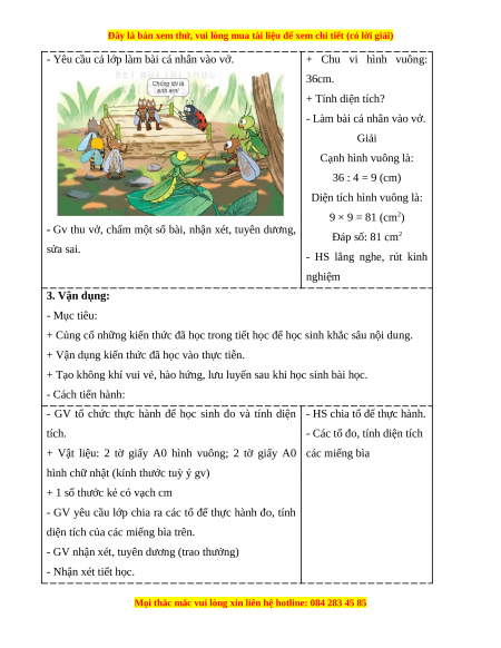 - Làm bài cá nhân vào vở. Giải Cạnh hình vuông là: 36 : 4 = 9 (cm) Diện tích hình vuông là: 9 × 9 = 81 (cm2)