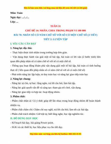 BÀI 70: NHÂN SỐ CÓ NĂM CHỮ SỐ VỚI SỐ CÓ MỘT CHỮ SỐ (3 TIẾT) TIẾT 2: LUYỆN TẬP