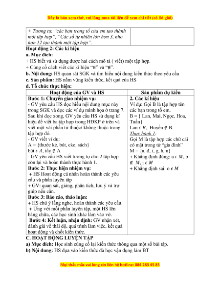 + Hình thành kĩ năng nhận biết phần tử của một tập hợp. b. Nội dung: