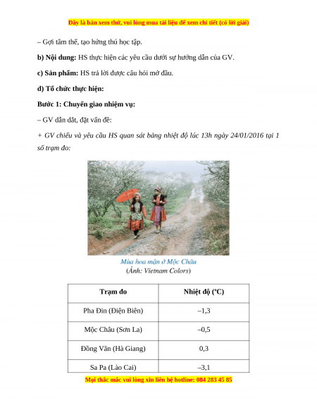 + GV chiếu và yêu cầu HS quan sát bảng nhiệt độ lúc 13h ngày 24/01/2016 tại 1 số trạm đo: Trạm đo Nhiệt độ (oC) Pha Đin (Điện Biên) ‒1,3 Mộc Châu (Sơn La) ‒0,5 Đồng Văn (Hà Giang) 0,3 Sa Pa (Lào Cai) ‒3,1