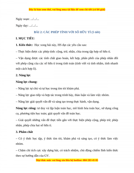 BÀI 2: CÁC PHÉP TÍNH VỚI SỐ HỮU TỈ (5 tiết) I. MỤC TIÊU: