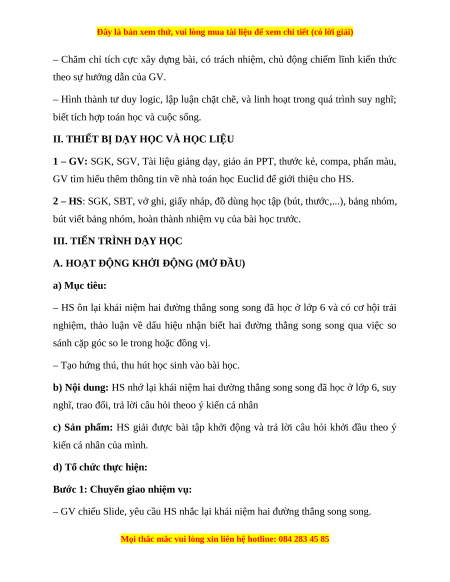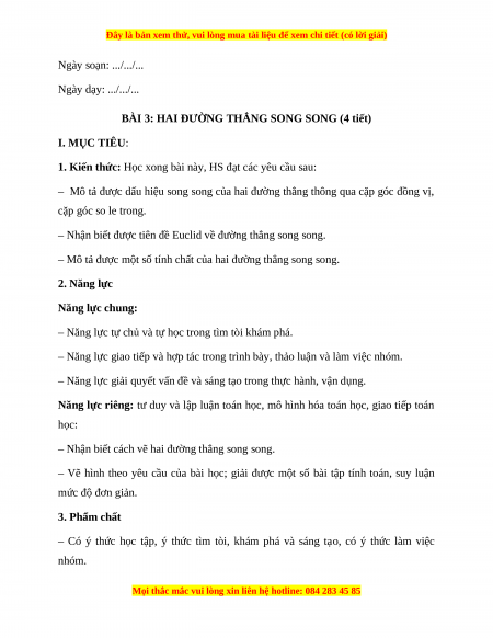 BÀI 3: HAI ĐƯỜNG THẲNG SONG SONG (4 tiết) I. MỤC TIÊU:
