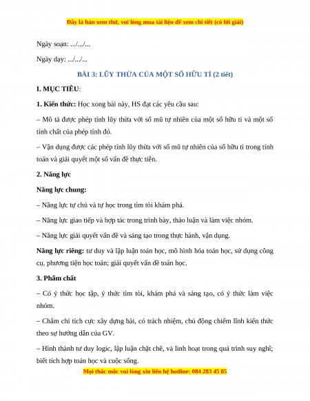 BÀI 3: LŨY THỪA CỦA MỘT SỐ HỮU TỈ (2 tiết) I. MỤC TIÊU: