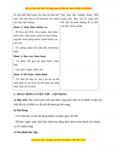 – HS ghi nhớ công thức tính chỉ số BMI và giải được các bài tập tính chỉ số BMI,