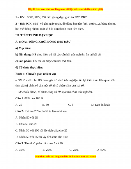 Câu 2. Để tìm 25% của 50 ta làm như sau: A. Nhân 50 với 25 B. Chia 50 cho 25