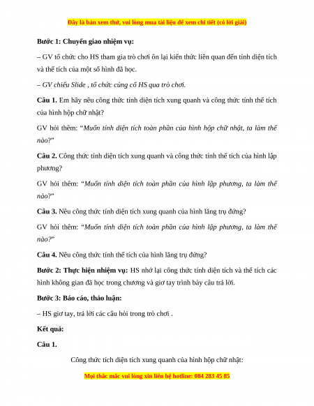 Bước 2: Thực hiện nhiệm vụ: HS nhớ lại công thức tính diện tích và thể tích các