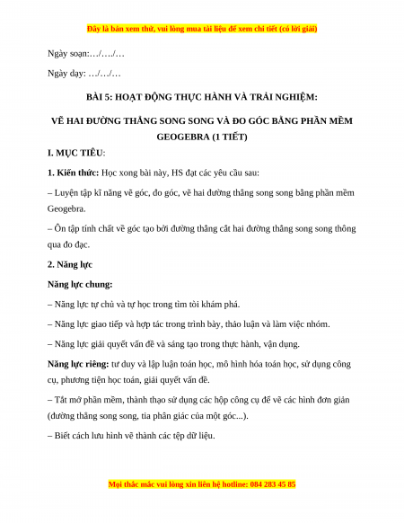 VẼ HAI ĐƯỜNG THẲNG SONG SONG VÀ ĐO GÓC BẰNG PHẦN MỀM GEOGEBRA (1 TIẾT) I. MỤC TIÊU: