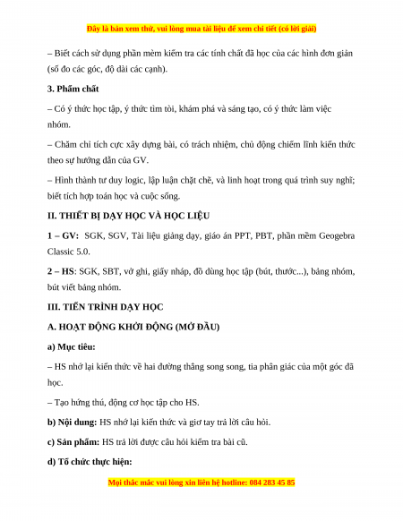 – Ôn tập tính chất về góc tạo bởi đường thẳng cắt hai đường thẳng song song thông qua đo đạc. 2. Năng lực Năng lực chung: