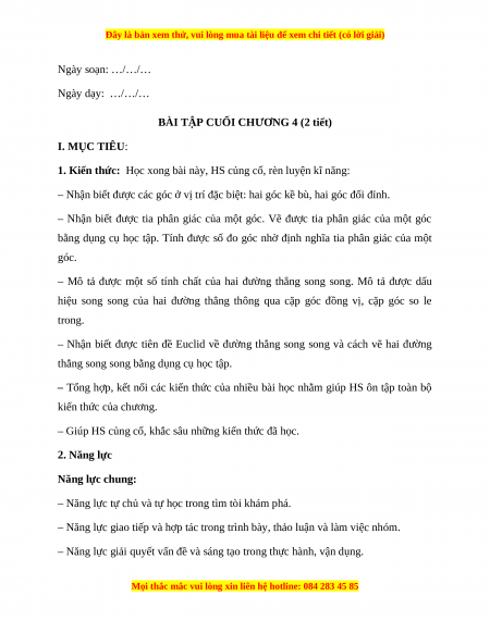BÀI TẬP CUỐI CHƯƠNG 4 (2 tiết) I. MỤC TIÊU: