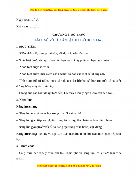 BÀI 1: SỐ VÔ TỈ. CĂN BẬC HAI SỐ HỌC (4 tiết) I. MỤC TIÊU: