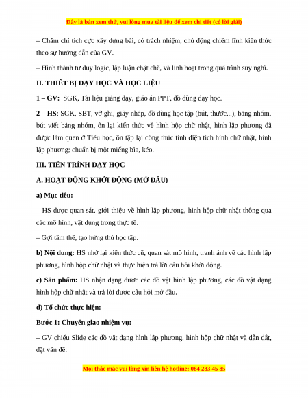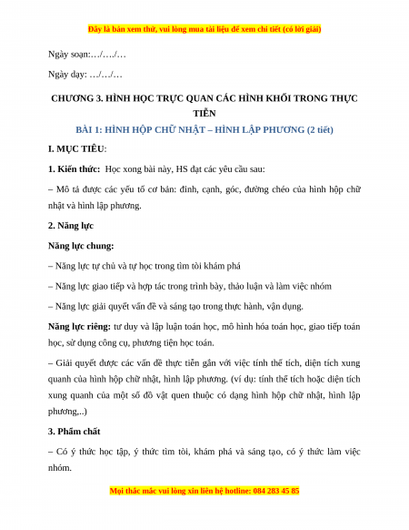 BÀI 1: HÌNH HỘP CHỮ NHẬT – HÌNH LẬP PHƯƠNG (2 tiết) I. MỤC TIÊU: