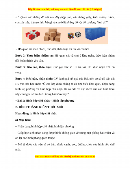c) Sản phẩm: HS nhận dạng được các đồ vật hình lập phương, các đồ vật dạng