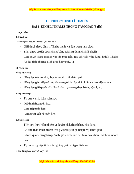 BÀI 1: ĐỊNH LÍ THALÈS TRONG TAM GIÁC (3 tiết) I. MỤC TIÊU: