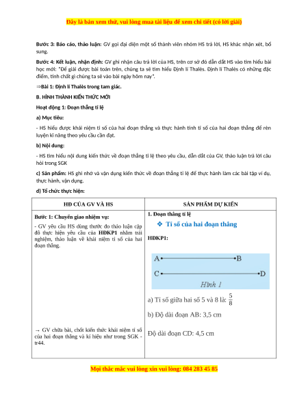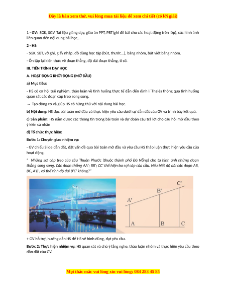 học mới: “Để giải được bài toán trên, chúng ta sẽ tìm hiểu Định lí Thalès. Định lí Thalès có những đặc