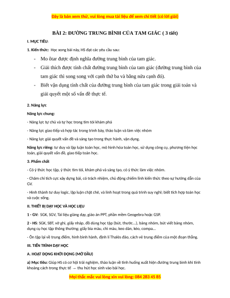 BÀI 2: ĐƯỜNG TRUNG BÌNH CỦA TAM GIÁC ( 3 tiết) I. MỤC TIÊU: